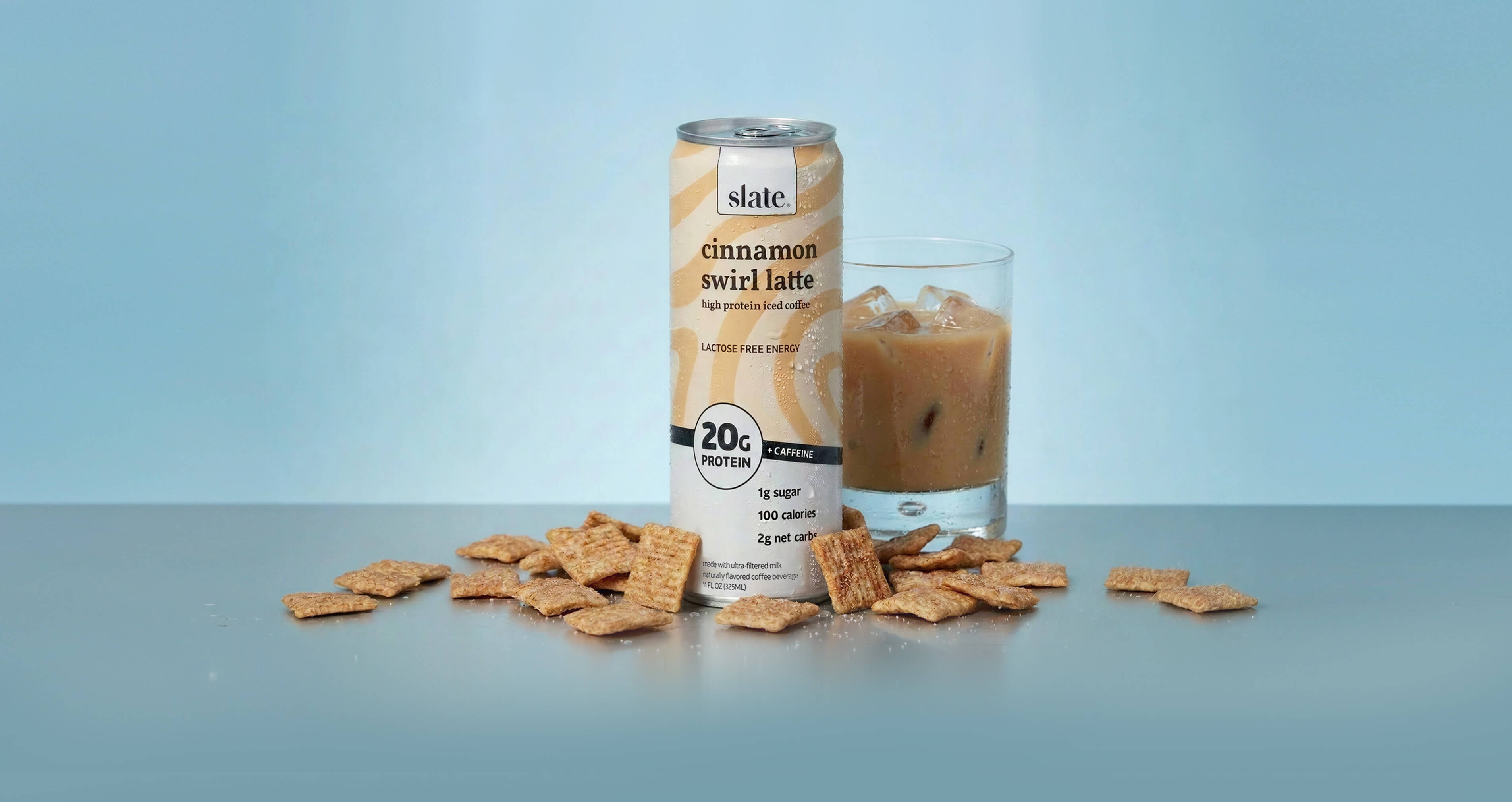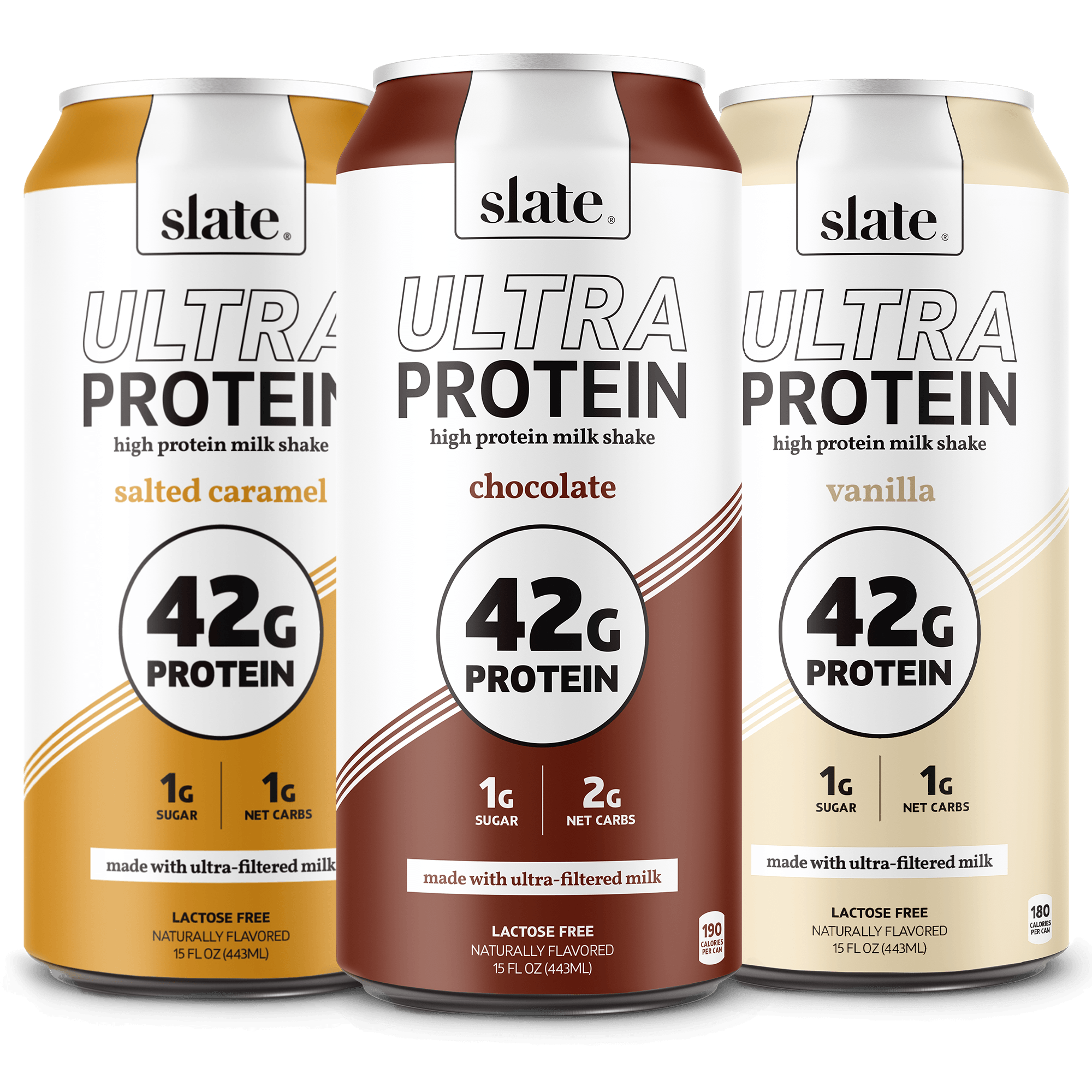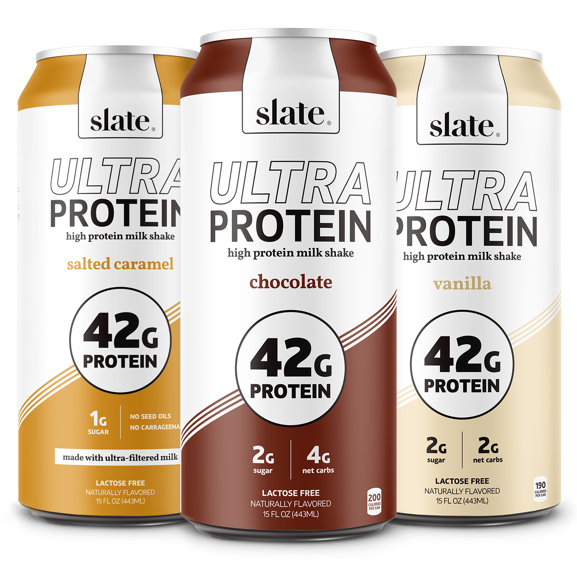 Slate 20g protein milk shakes, 20g protein iced coffees, cookies, and drink mixes are made with all-natural ingredients.