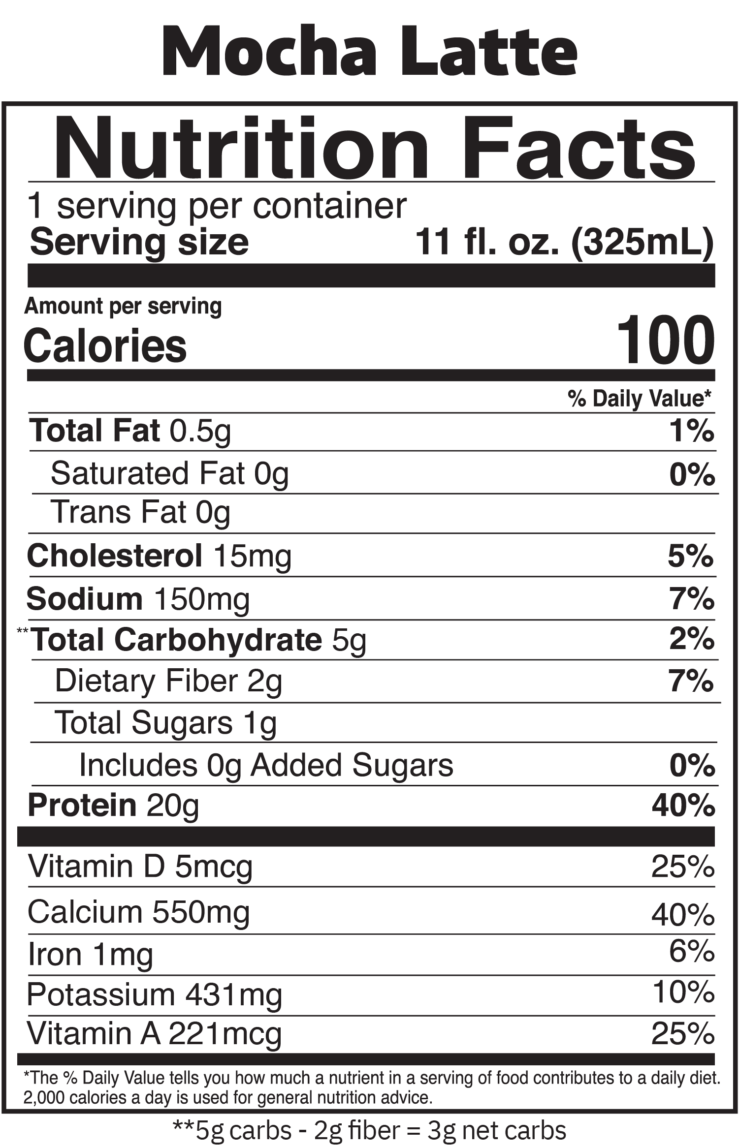 Ingredients: Brewed Coffee (Water, Coffee), Ultrafiltered Milk, Less than 2% of Natural Flavors, Cocoa (Processed with Alkali), Cellulose Gel, Dipotassium Phosphate, Pectin, Monk Fruit, Salt, Cellulose Gum, Natural Caffeine, Stevia Leaf (Reb M), Lactase Enzyme,Vitamin A Palmitate, Vitamin D3