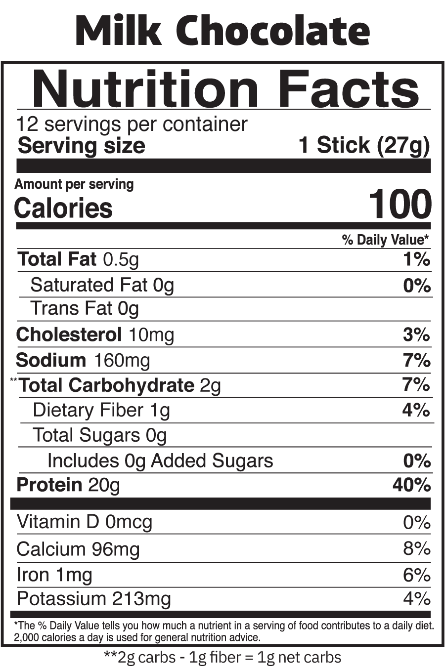 ‘The Stuff From Your Childhood.’ We packed 20g protein and 0g sugar into a 100 calorie, delicious chocolate mix packets. This 12-pack is lactose free, and can be blended with water or milk to create the perfect on-the-go protein boost.