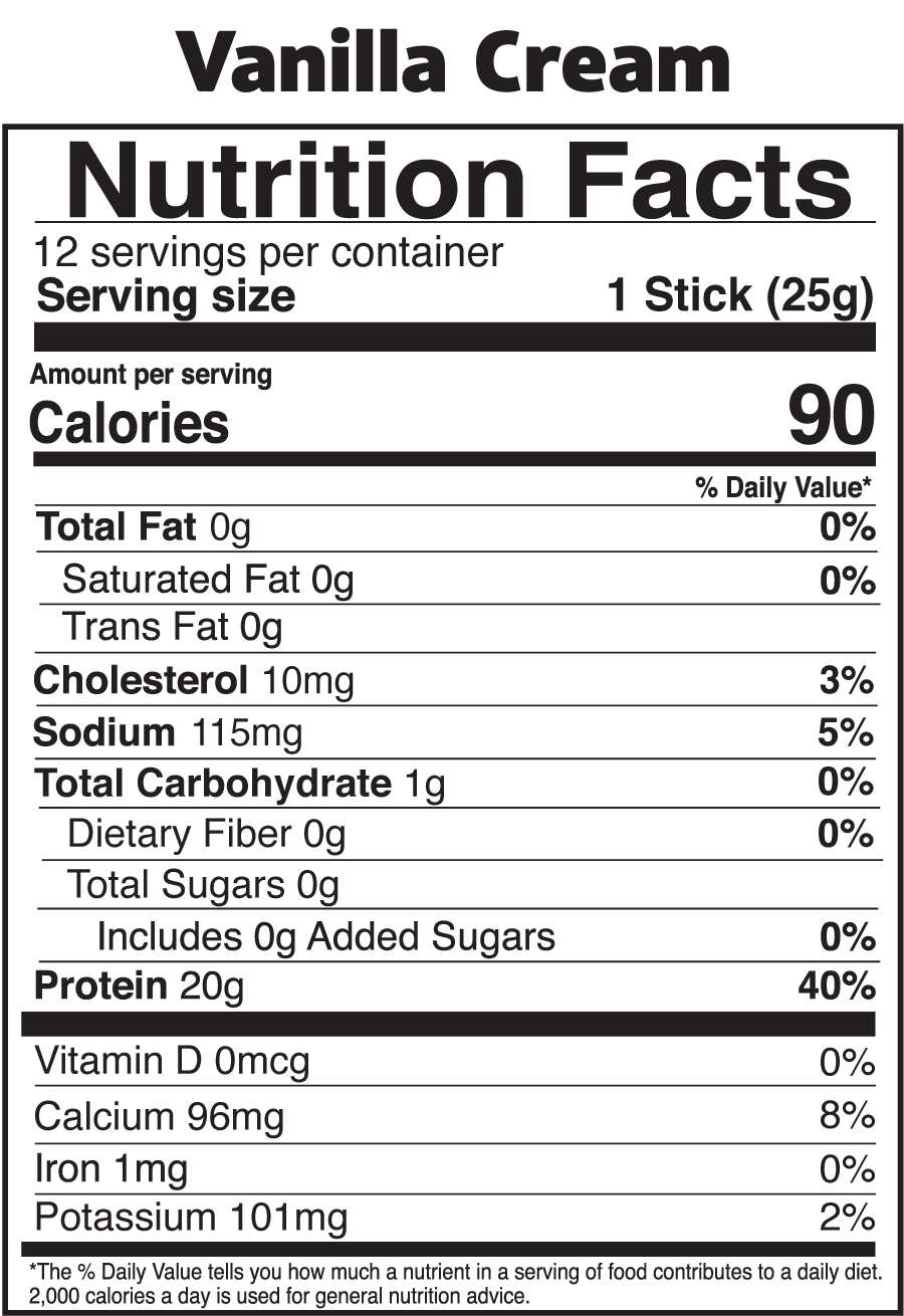 ‘Vanilla Cream Dream.’ Our Vanilla Cream mix boasts 20g protein, 0g sugar, and only 90 calories. This tasty 12-pack of lactose free