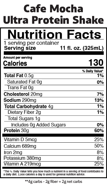 Smooth coffee and chocolate for your daily pick-me-up. With 30g of protein and just 1g of sugar, Café Mocha 30G Ultra Protein Shake pairs coffee with creamy chocolate for an easy, protein-packed start to your morning.