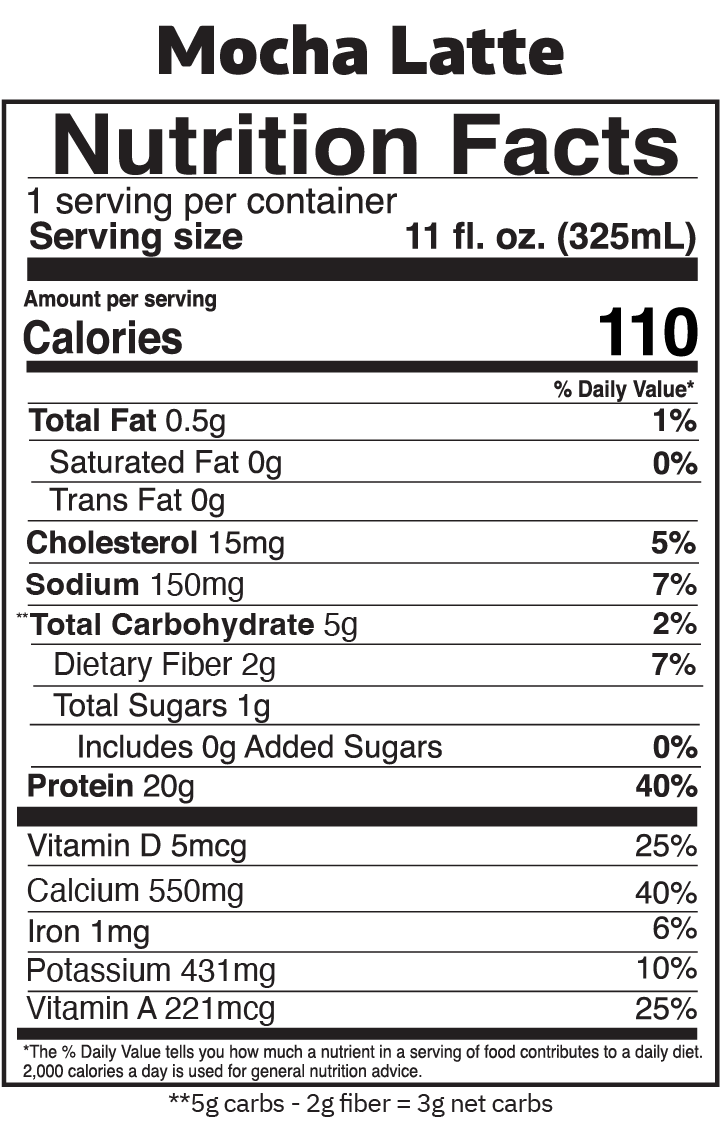 Brewed Coffee (Water, Coffee), Ultrafiltered Milk, Less than 2% of Natural Flavors, Cocoa (Processed with Alkali), Cellulose Gel, Dipotassium Phosphate, Pectin, Monk Fruit, Salt, Cellulose Gum, Natural Caffeine, Stevia Leaf (Reb M), Lactase Enzyme,Vitamin A Palmitate, Vitamin D3